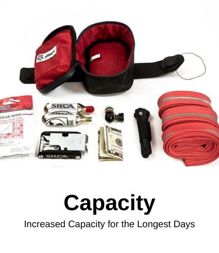 With the new Mattone Grande, we have now created a 'bigger brick' with .74L of internal volume almost 2x the volume of the original Mattone (0.41L). The Mattone Grande is capable of holding up to 3 road tubes along with 2 CO2 cartridges, 2 tire levers and a multi-tool. It can also easily hold up to two 29x2.5 MTB tubes along with CO2, levers and Multi-tool, the Mattone Grande is ideal for those long adventure rides or races where you must be prepared for everything.